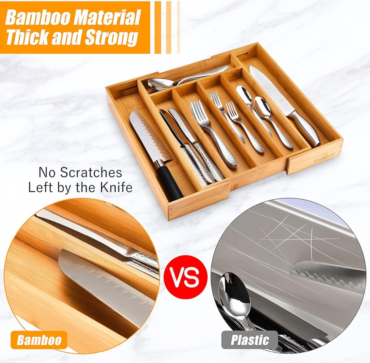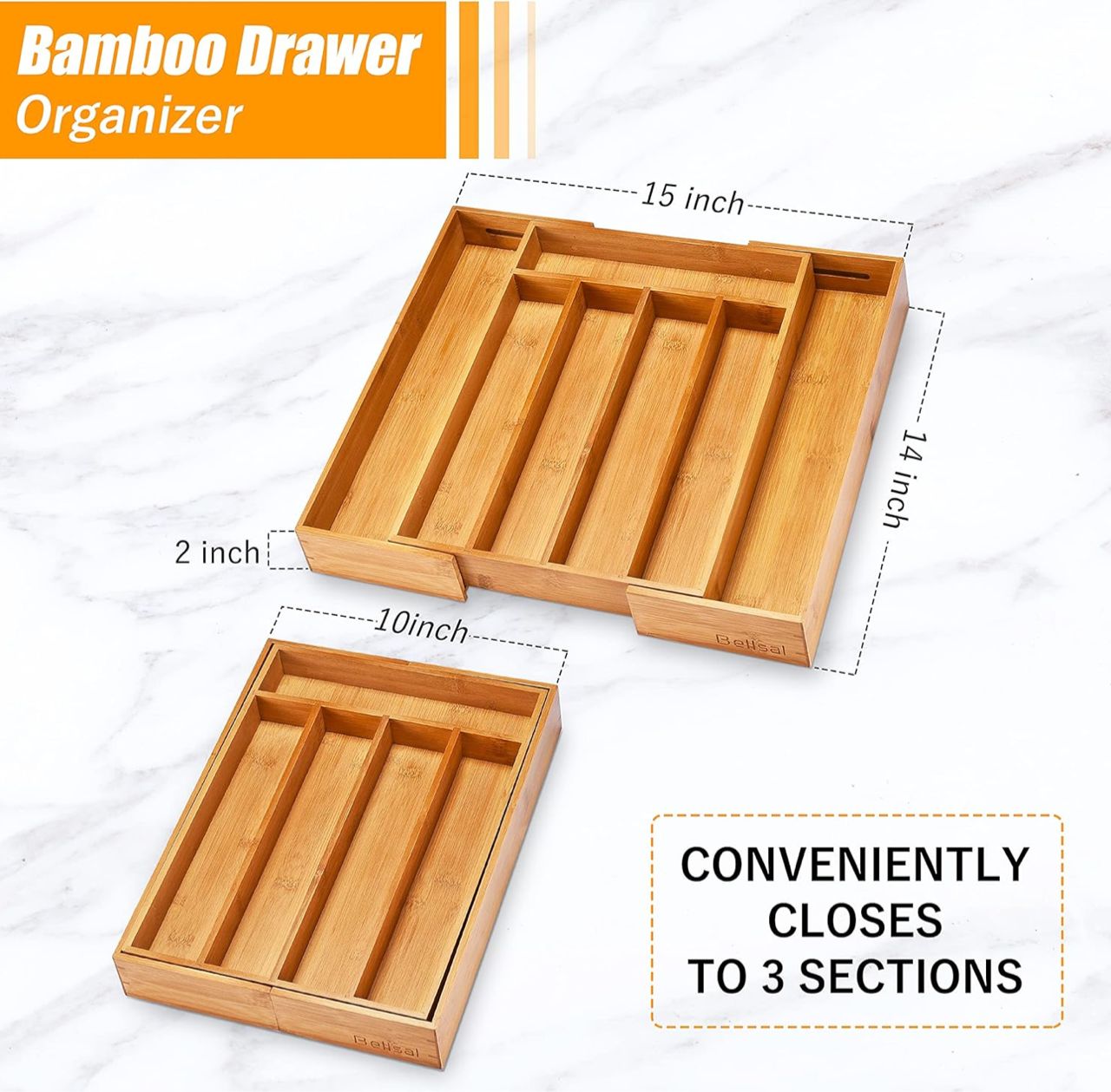 * Fit your drawer perfectly Still measuring every kitchen drawer and buying a kitchen drawer organizer of the same size? Our bamboo silverware drawer organizer is designed with 5-7 compartments. Thanks to its adjustable features, our expandable drawer organizer can be expanded from 10 to 15 inch wide, Perfect for any kitchen drawers.